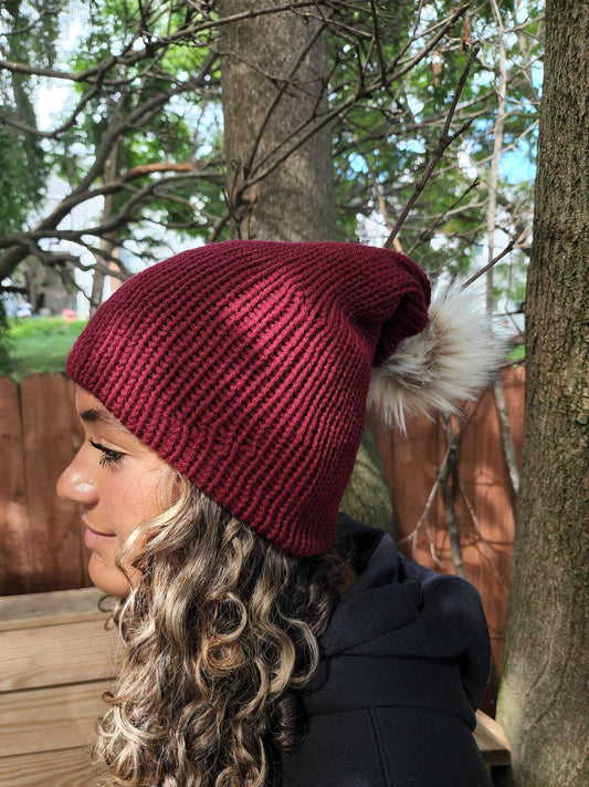 Faux Fur Pom Beanie, knit beanie, winter hat, pom pom hat: Maroon