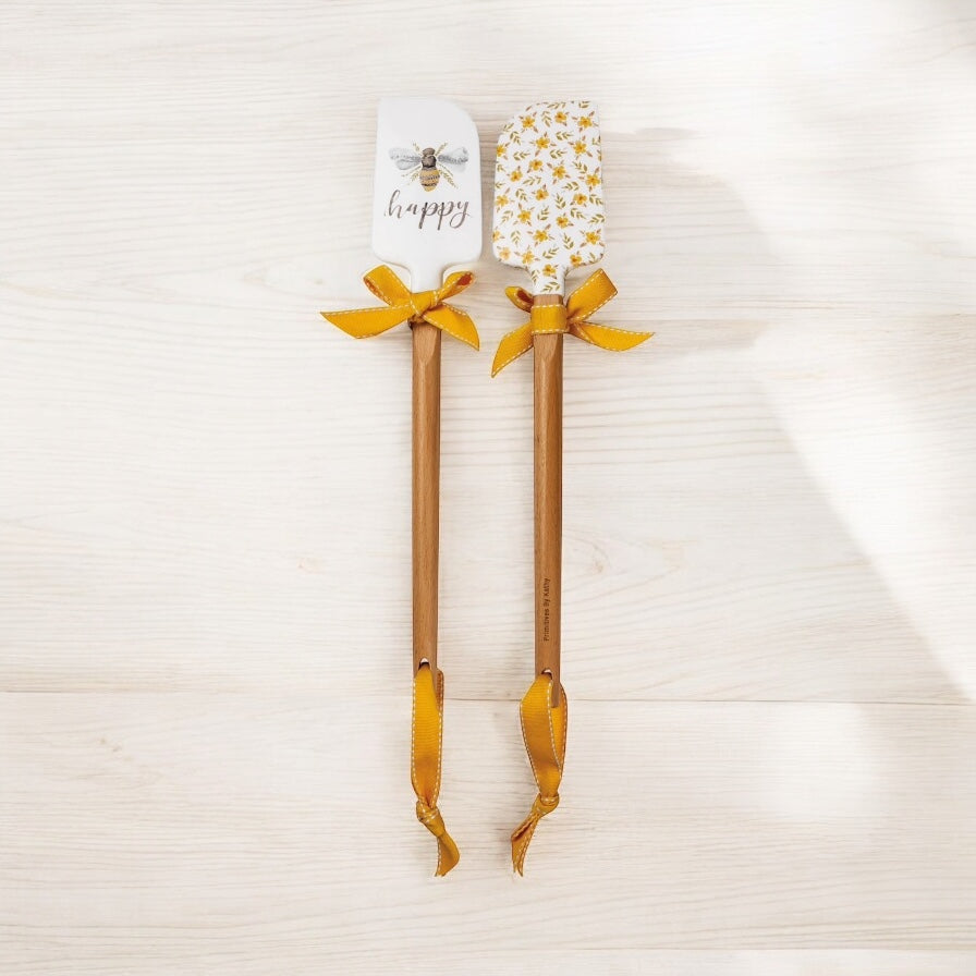 A silicone spatula with a wooden handle. Features "Happy" sentiment on front with bee design and floral designs on the back. Handles feature laser cut logos and drilled hole with ribbon loop for easy hanging. Hand-wash recommended. Not microwave safe.