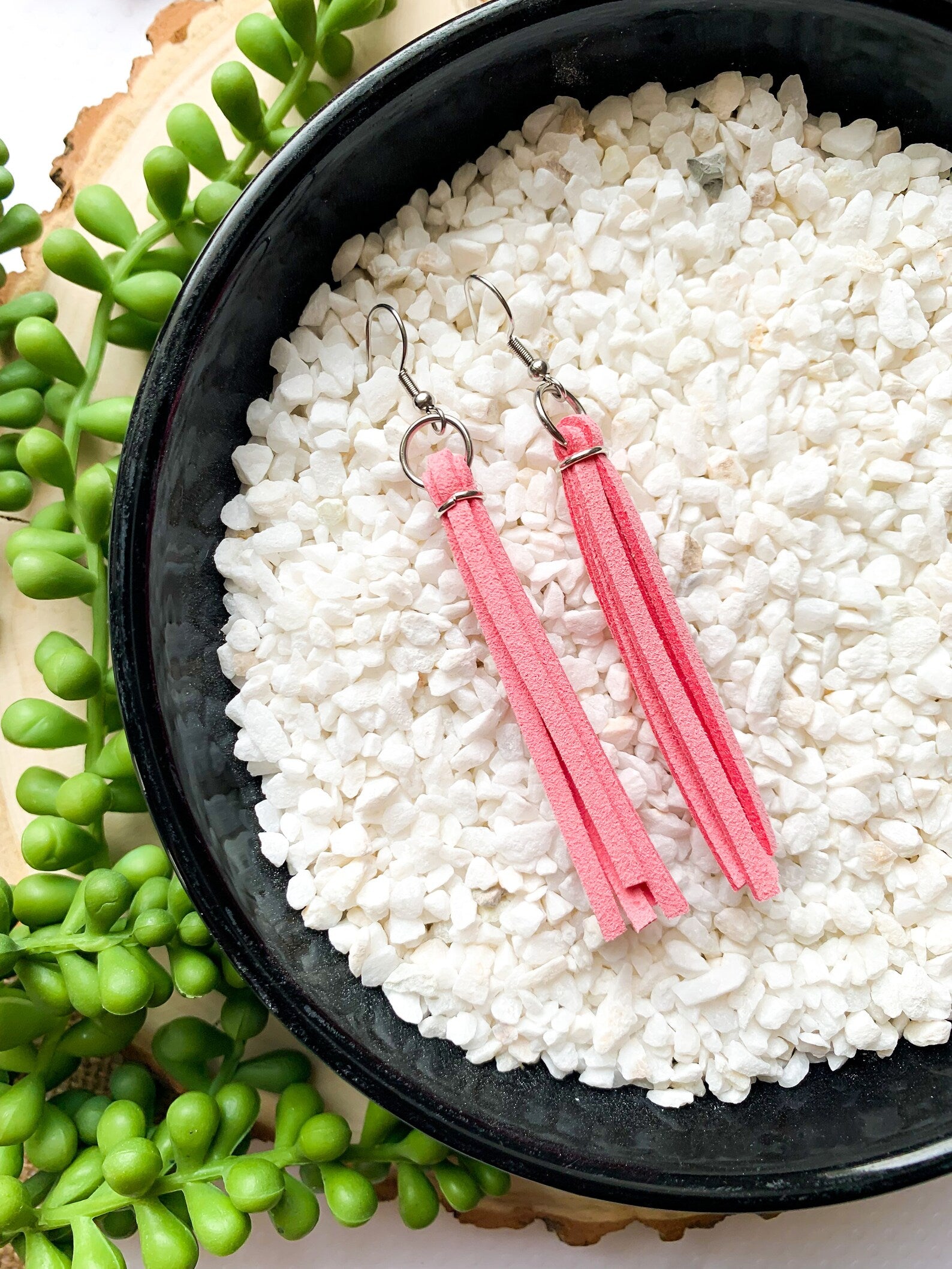 Bubble Gum Pink Suede Leather Tassel Earrings