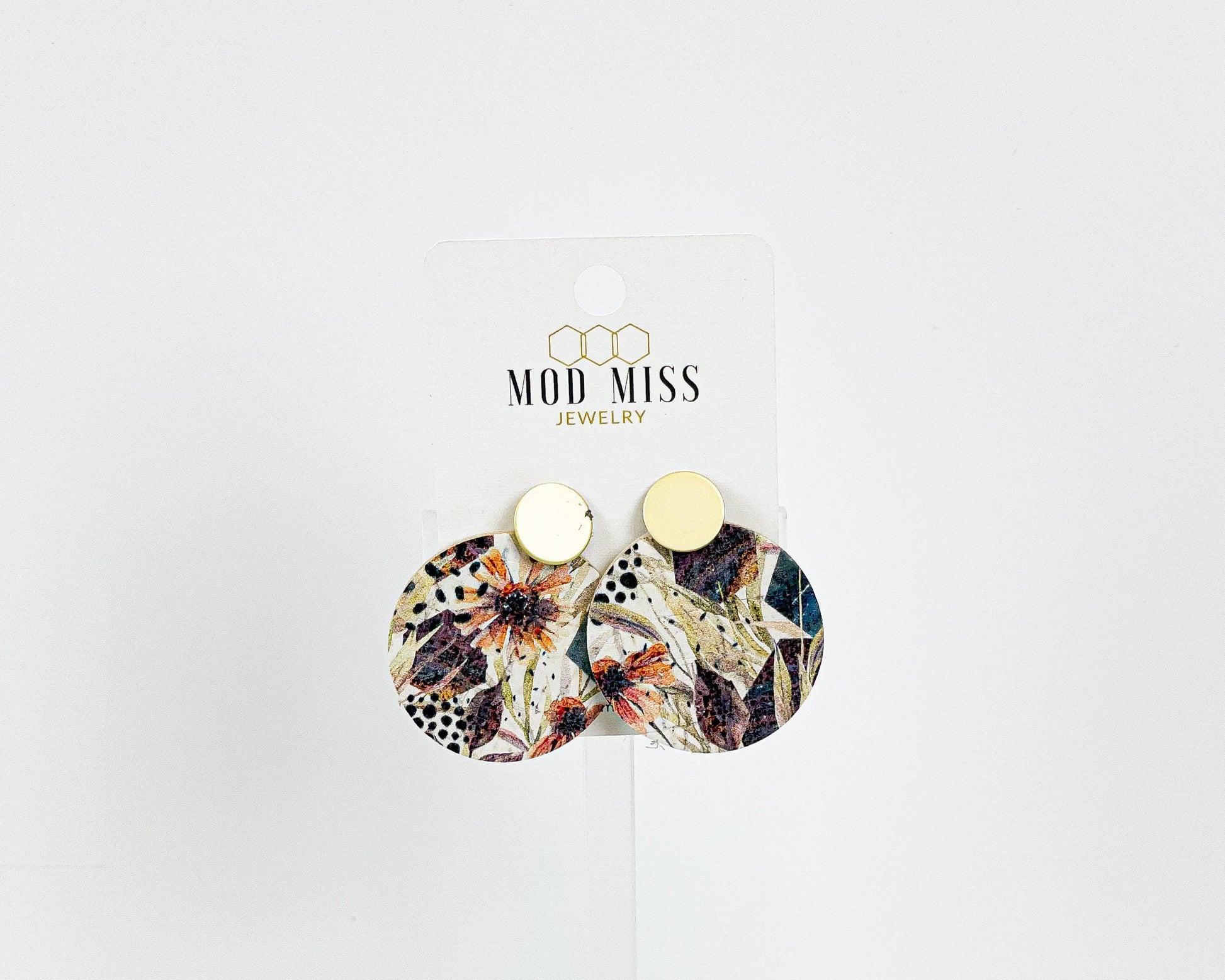 2-inch Round Cork + Leather attached to a 10mm gold stud. Lead and nickel free. Please note that due to pattern and fabric differences, not all pieces will match 100% but we do our best to make sure they look compatible.