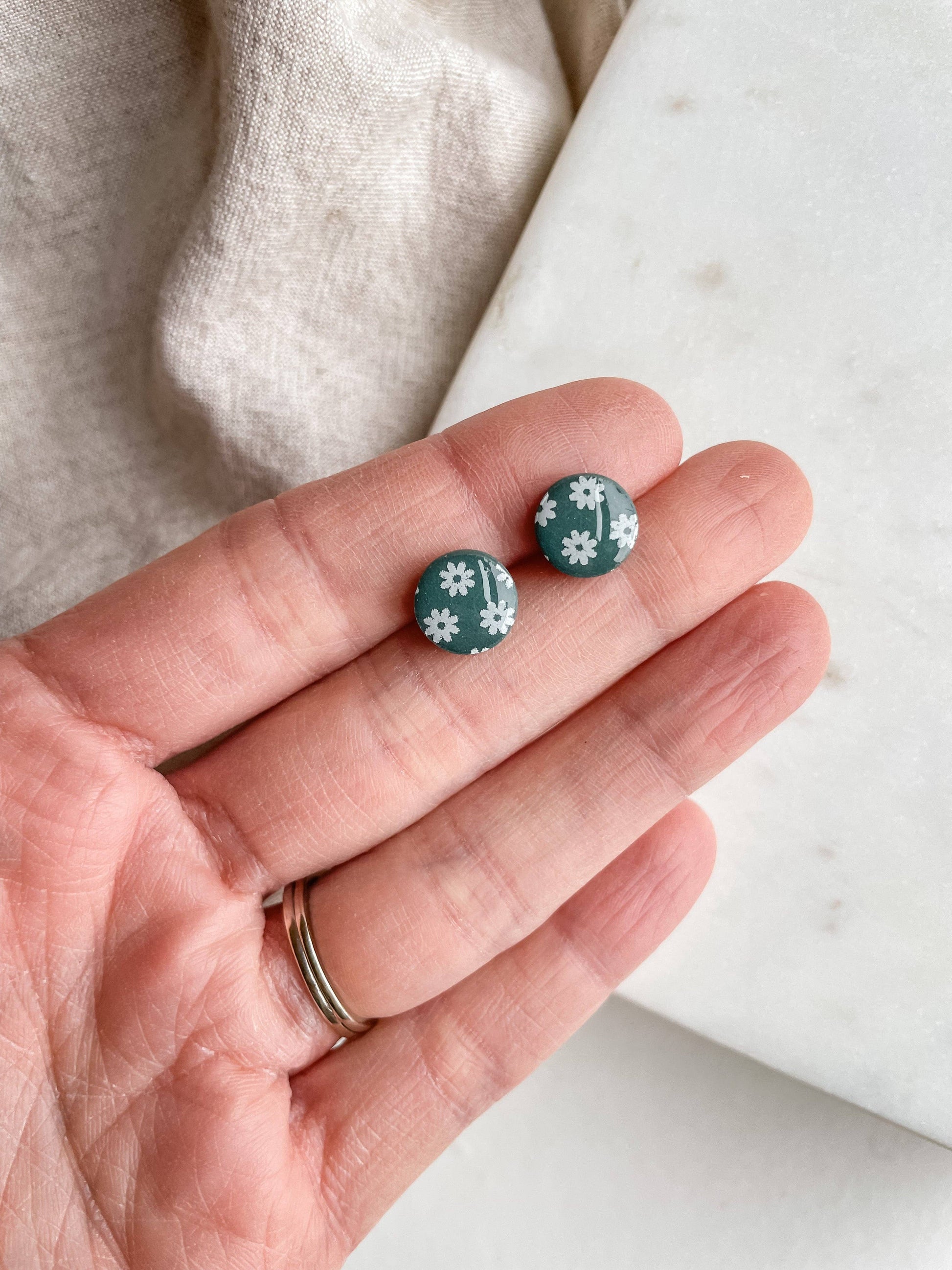 These studs come in the cutest retro daisy print and will add a fun little pop of color to your outfit. They are simple and perfect for every day wear! Measurements: 0.35 in diameter Material: Polymer clay, resin & hypoallergenic posts *Knox & Nora earrings are handmade with care. Note that each pair may have slight imperfections and variations in color, pattern, texture, or shape.