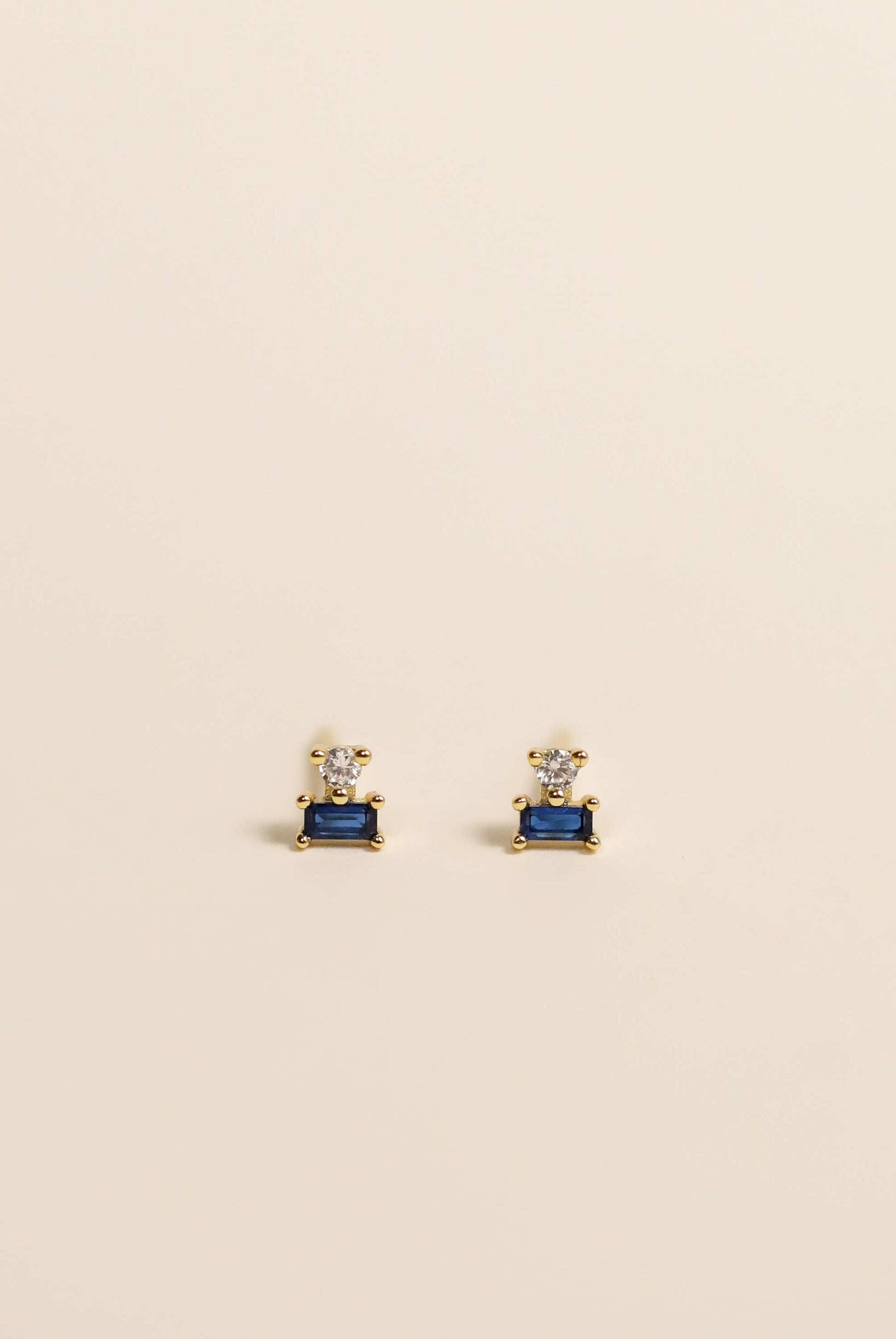 A singular sapphire-colored baguette stacked underneath a dainty circular set CZ.
