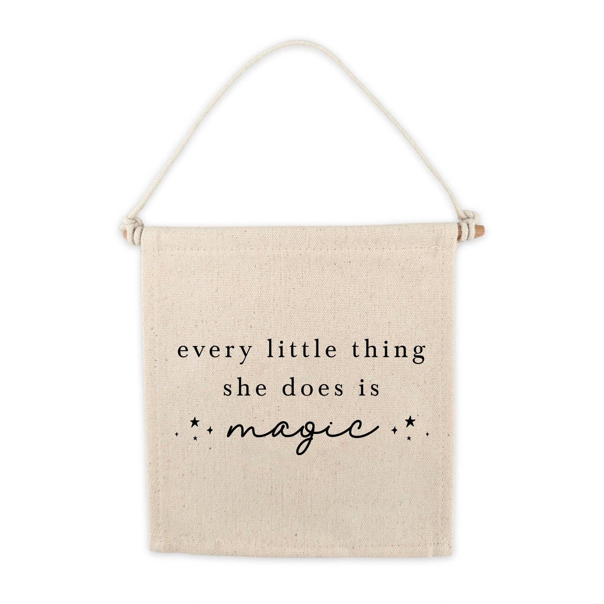 Every Little Thing She Does Is Magic Canvas Hang Sign Cherrypick canvas hang signs are an easy and affordable way to decorate with minimal effort! Whether hanging on a wall, doorknob, bookshelf, or play space, our canvas hang signs add a fun and magical touch, making every space a happy place. Customers love our canvas hang signs because they are: * Made of premium 100% cotton canvas in a beautiful, off-white natural canvas colour * Hand sewn and screen printed by hand with non-toxic ink * Strung on a durable cotton twine and hung using a wood dowel * Perfect for playroom, nursery, and kids wall decor! Dimensions: Canvas 7.5x8”, total hanging dimension is 13”