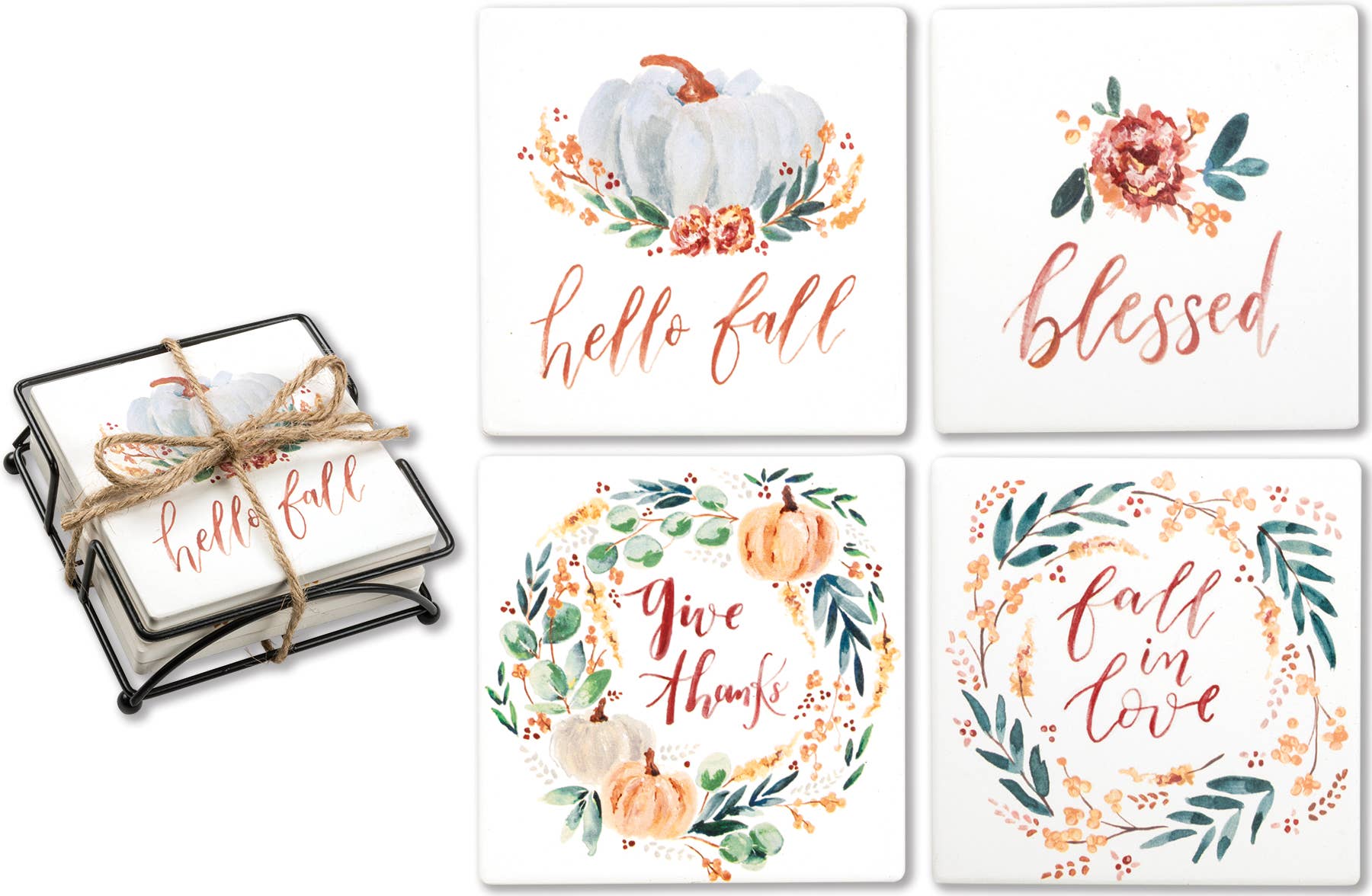A set of four watercolor art-inspired absorbent stone coasters lending pumpkin and flower wreath designs and hand lettered "Hello Fall," "Blessed," "Fall In Love," and "Give Thanks" sentiment. Complements well with coordinating design pieces for a charming home decor collection. Comes with wire holder.
