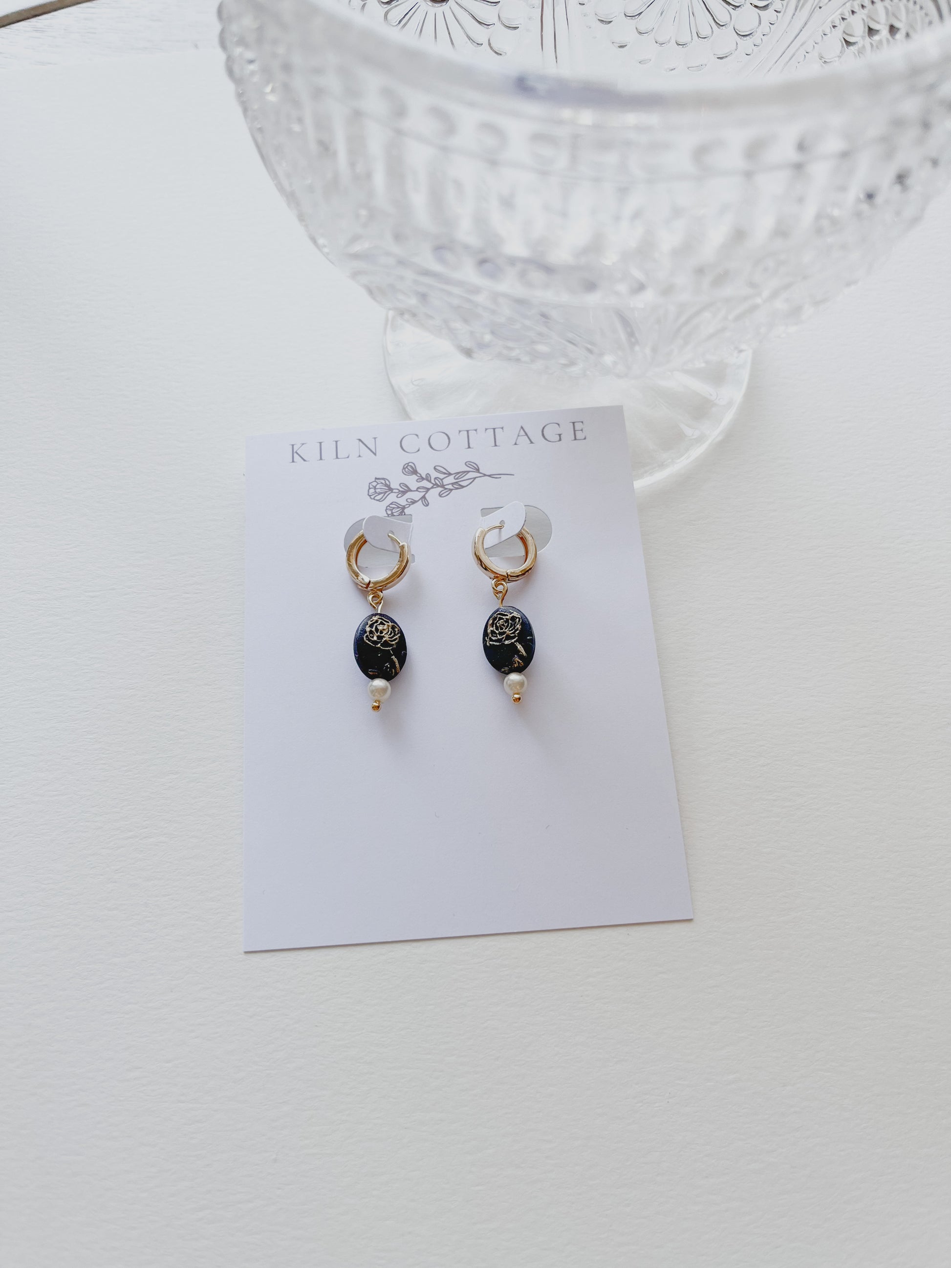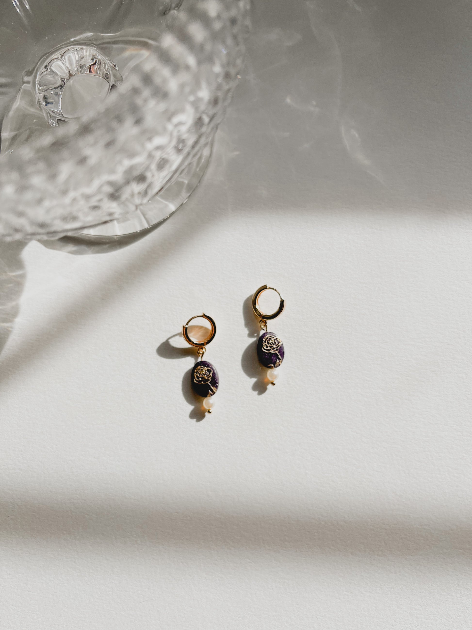 These vintage inspired huggies are the perfect earring to go with any outfit. The Deep purple, soft gold abstract rose, and pearl combination are a modern take on a classic style.