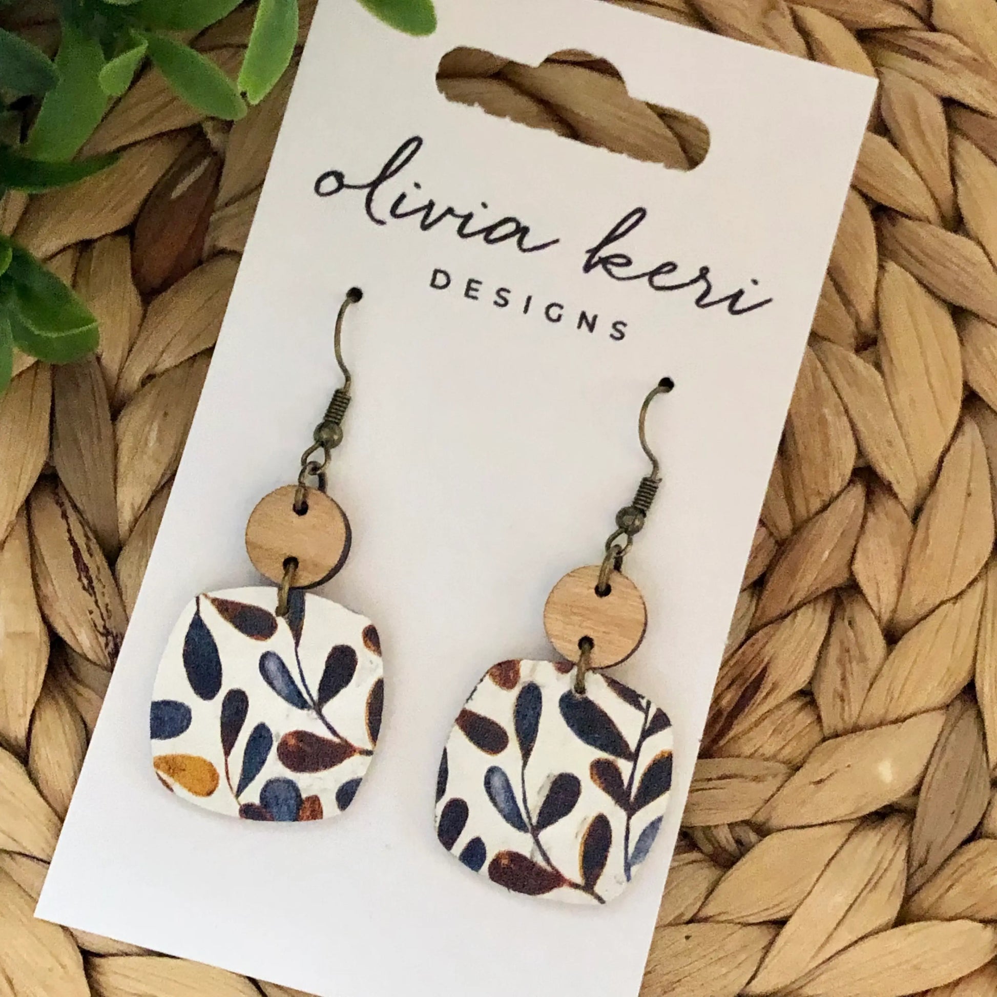 Beautiful cork on eather earrings with a wood accent. This listing is for one pair of earrings measuring 1" x 1.5". Ear hooks add approximately .5 inches in length to the overall design. DETAILS *Genuine Cork on Leather *Antique Bronze Nickel-Free Wire *Cherry Wood Accent