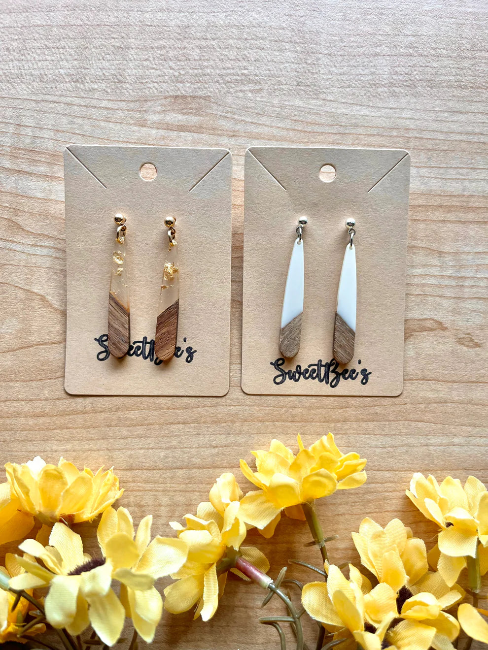 Wood and resin dangle earrings. Half wood, half resin paired with drop dangle pieces.