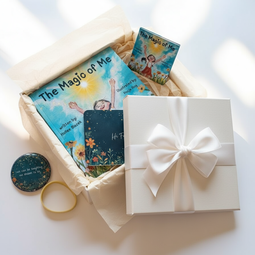 Just added: Magic of Me Box Gift Set. Will include a signed copy of the book, stickers, bracelet, and a pencil. All with uplifting, positive messages. Boxes will vary. Fancy gift wrap/box not included.