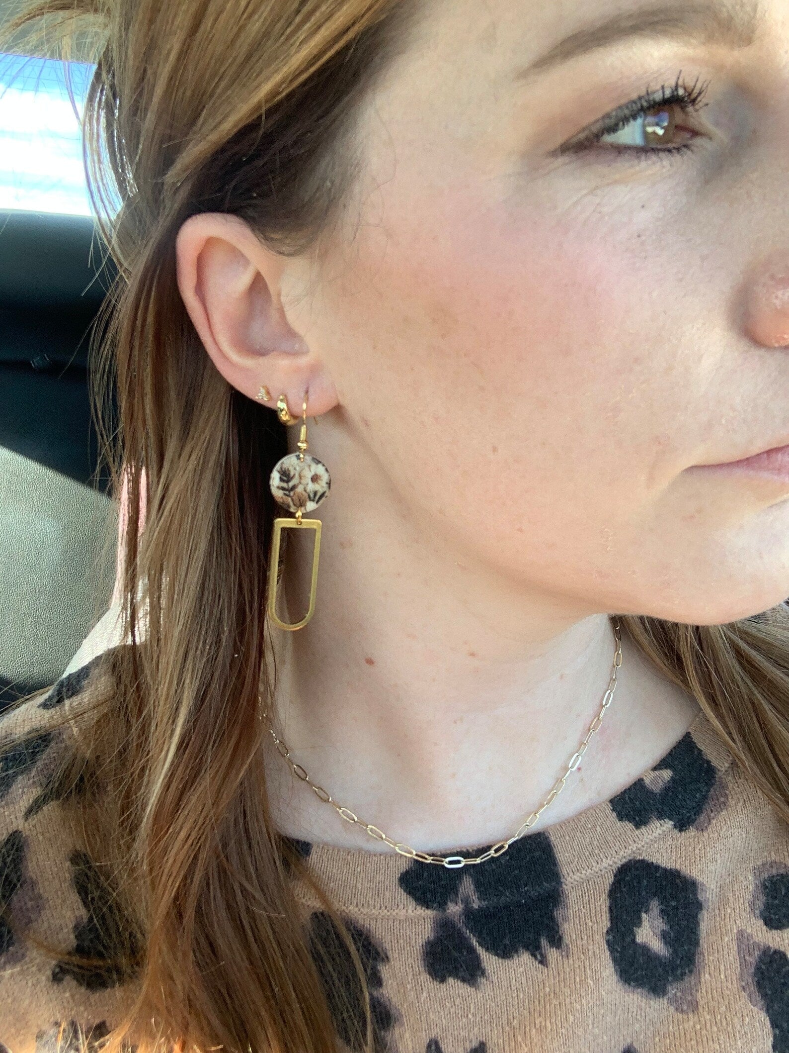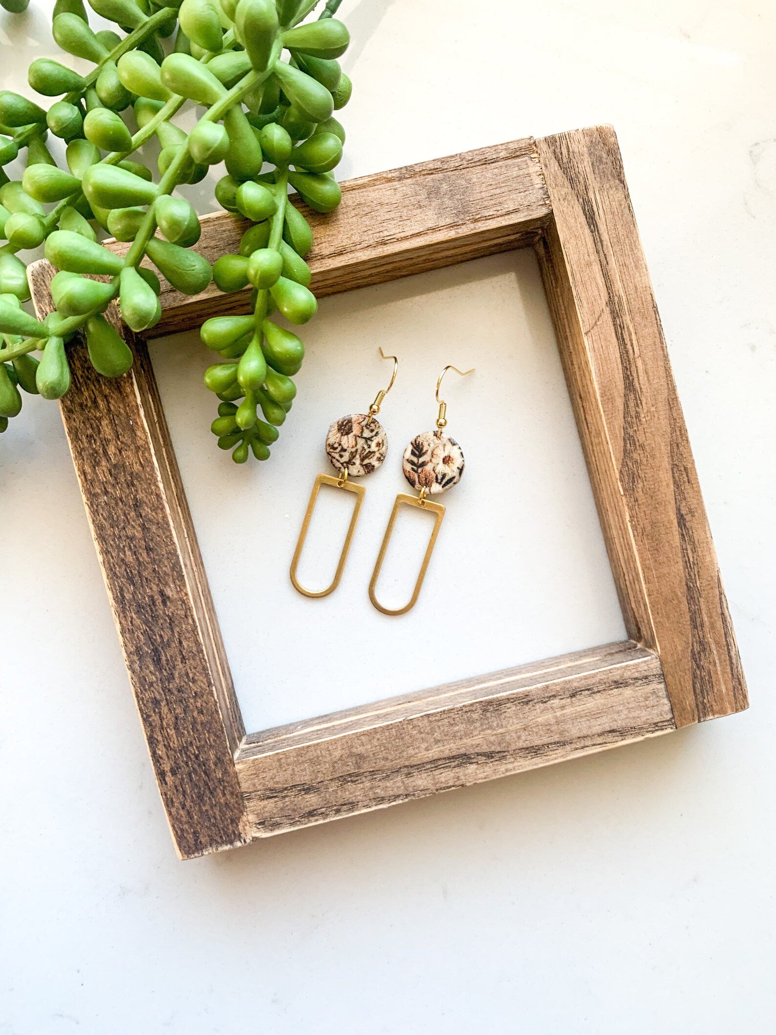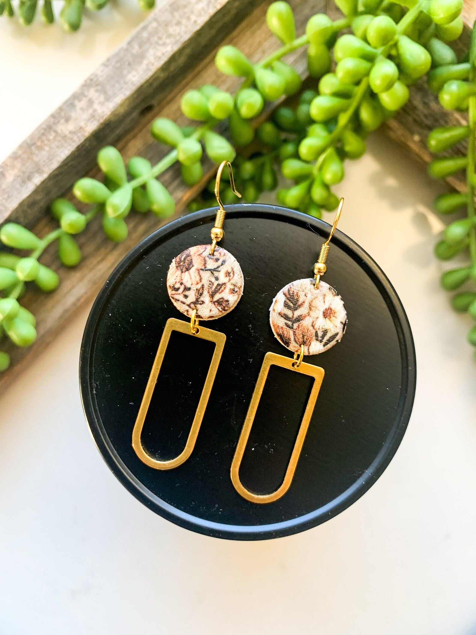 Vintage Neutral Floral Circle| Rounded Rectangle Brass| Genuine Leather Earrings