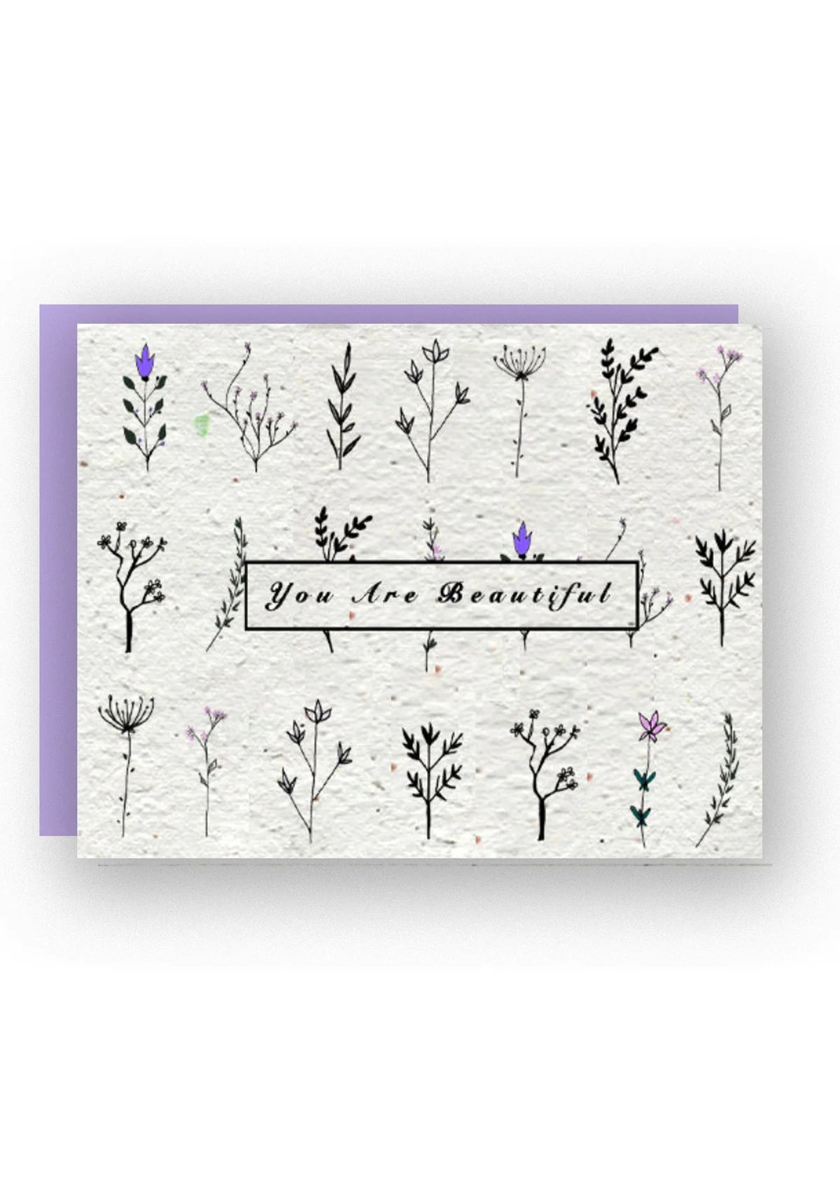 Celebrate the beauty of nature and share a heartfelt message with our "You Are Beautiful" wildflower seed paper card. This enchanting card is not just a piece of stationery; it's a gift that keeps on giving. Crafted with care, each card is made from biodegradable seed paper embedded with a mix of vibrant wildflower seeds, including lavender, carnation, rudbeckia, poppy, wild chamomile, and violas.